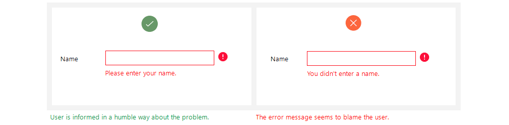 A good error message uses polite and considerate language to communicate the issue without making the user feel at fault for their actions.