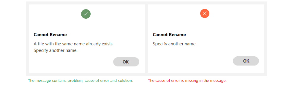 A good error message consists of three parts: identifying the problem, explaining its cause, and offering a possible solution. Whenever an error occurs, users want to fix it as quickly as possible. Therefore, error messages should include enough information to guide users toward a resolution.